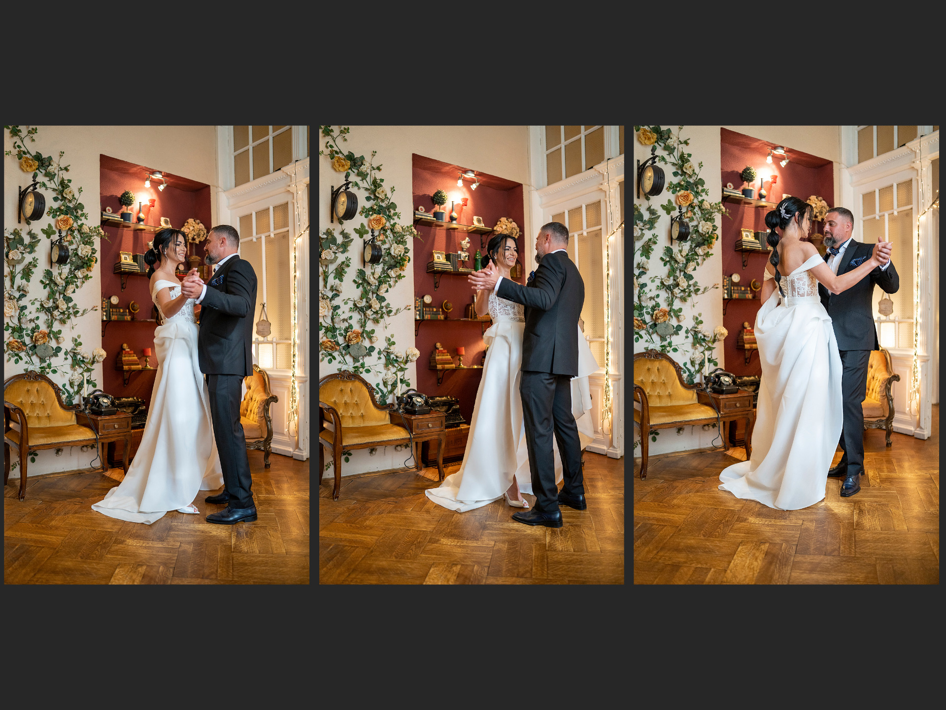 Mobilierul cu stil, draperiile cu ciucuri grei, candelabrele, luminile de atmosferă și muzica ta preferata auzindu-se discret, transformă fiecare ședință foto într-o experiență relaxată și intimă. Totul este armonios așezat, fără senzația de "decor forțat", astfel încât imaginile să rămână autentice, elegante și atemporale.